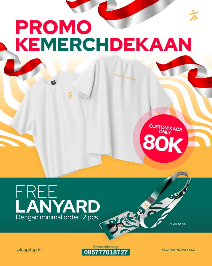 Khusus di bulan Agustus ini, dengan 80 ribu Rupiah aja kamu sudah bisa custom jersey maupun kaos dengan bonus lanyard gratis loh! Minimum ordernya cuma 12 pcs aja ya